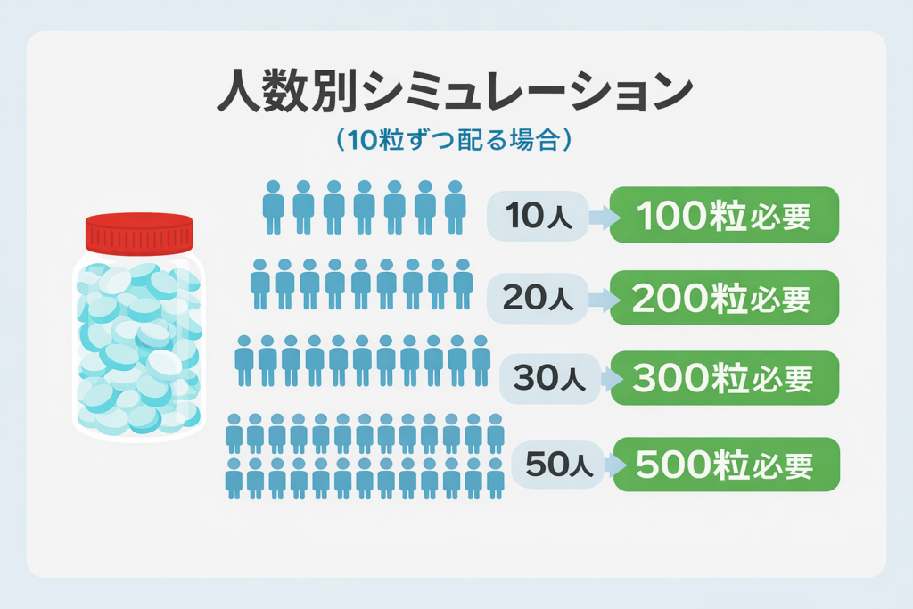 - 人数が多い場合は1粒単価で比較すると分かりやすい